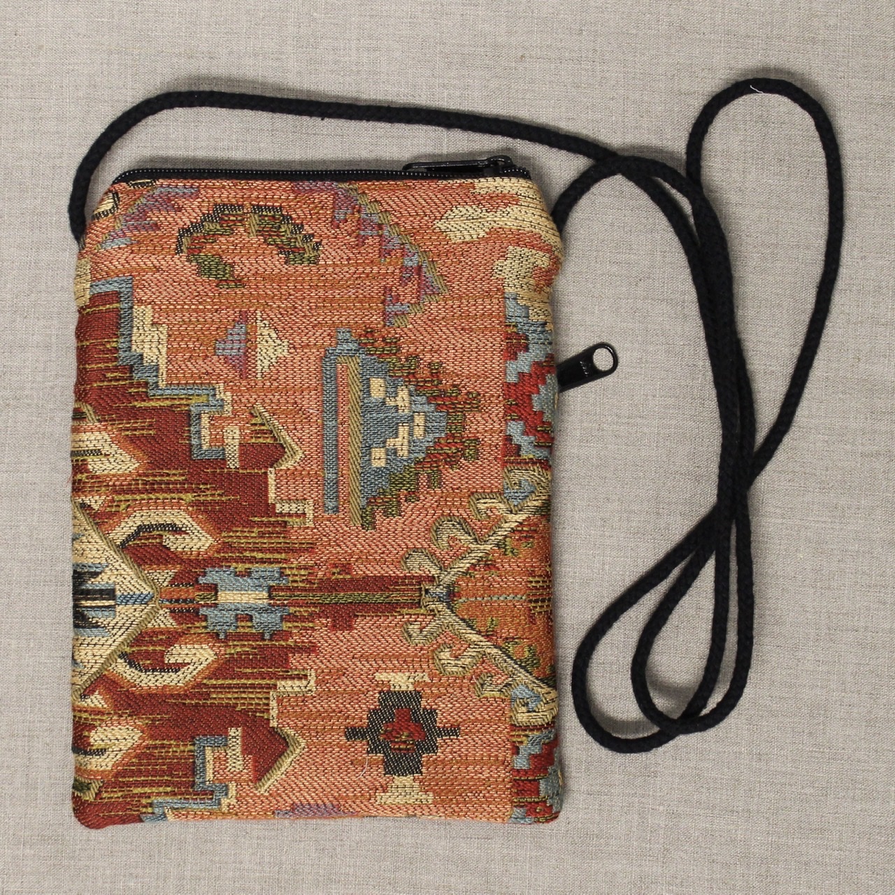These crossbody bags are made of long-wearing upholstery fabric, with a sturdy gold, grey, or tan twill lining (like a pair of Dockers pants). They have a cord strap with a zippered top opening. There is one outside zippered pocket.