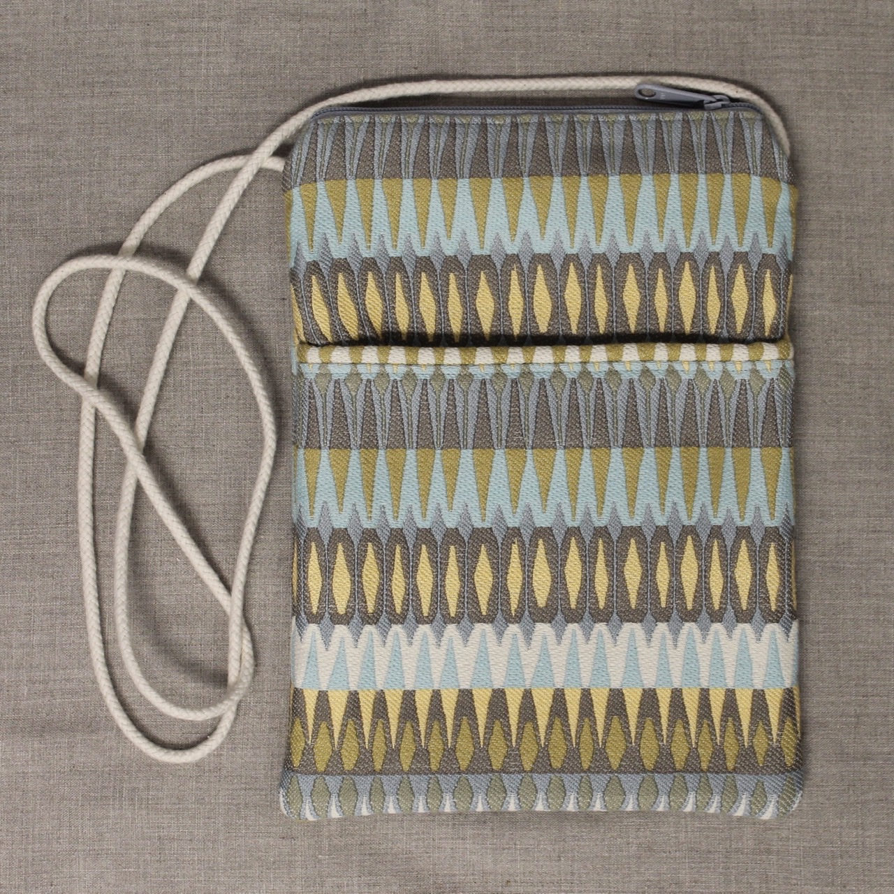 These crossbody bags are made of long-wearing upholstery fabric, with a sturdy gold, grey, or tan twill lining (like a pair of Dockers pants) with an interior pocket. They have a cord strap with a zippered top opening. One outside pocket is open and is great for keys and phone. On the other side is a zippered pocket that's great to secure papers or cards.