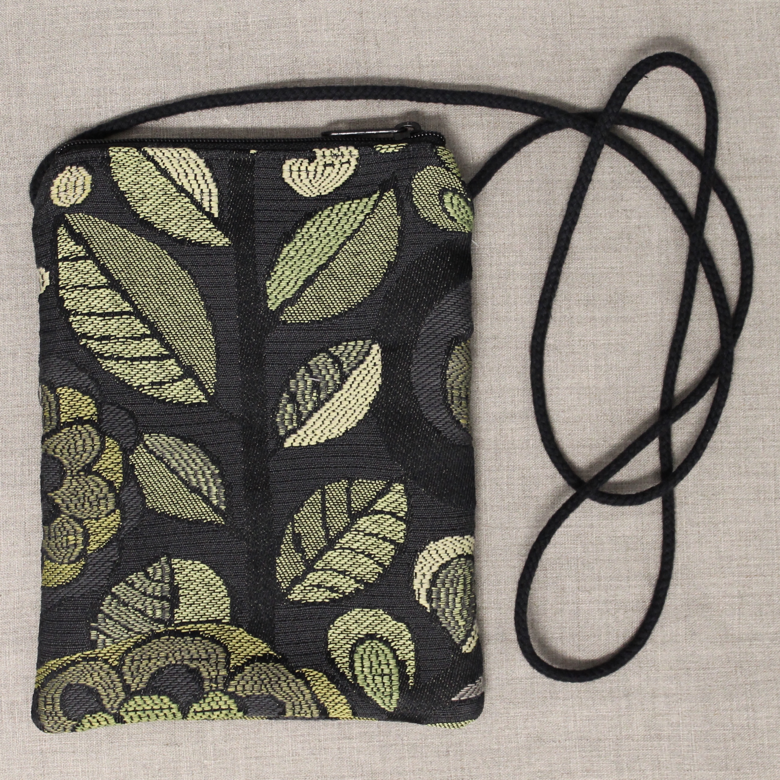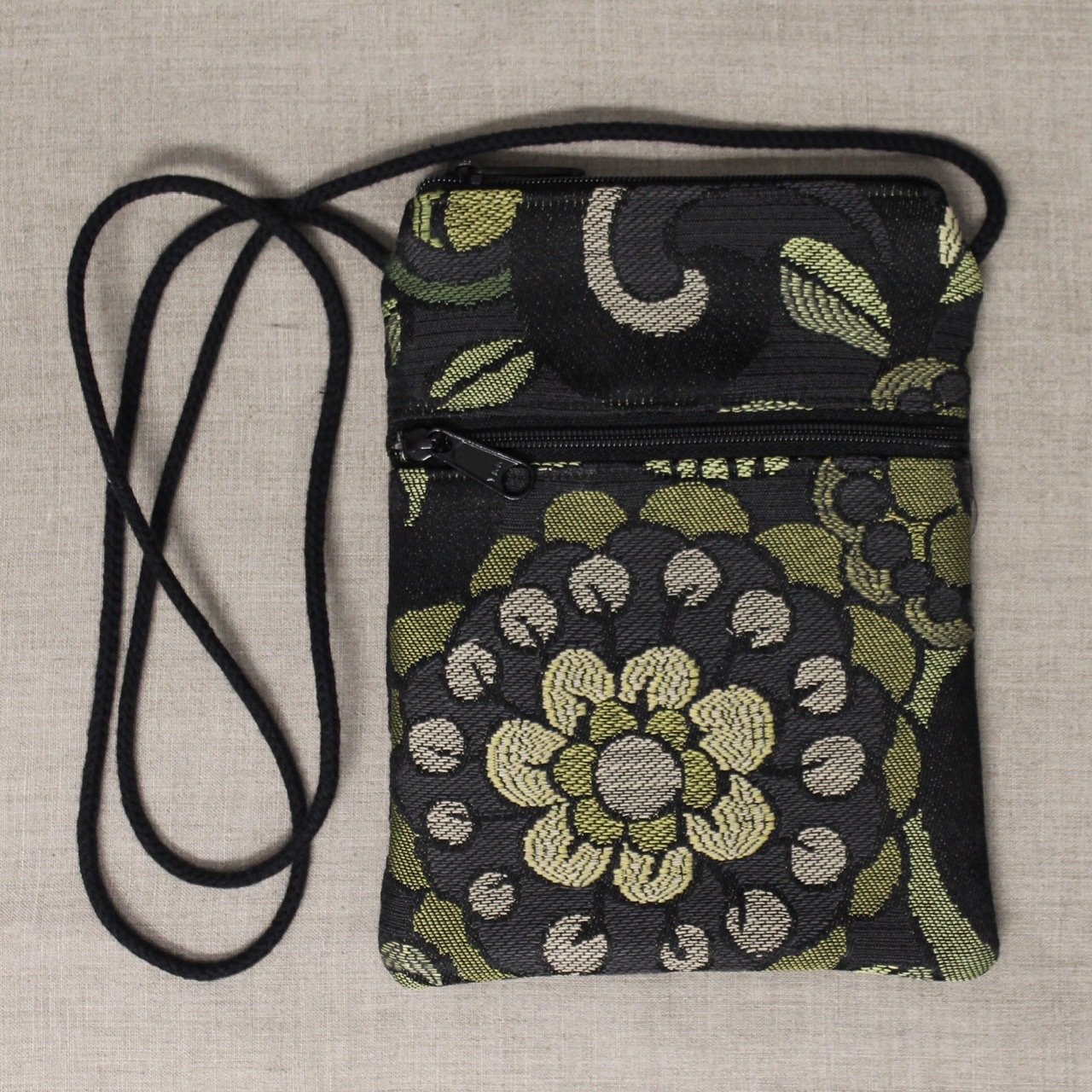 These crossbody bags are made of long-wearing upholstery fabric, with a sturdy gold, grey, or tan twill lining (like a pair of Dockers pants). They have a cord strap with a zippered top opening. There is one outside zippered pocket.