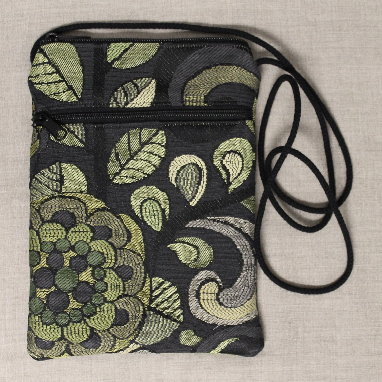 These crossbody bags are made of long-wearing upholstery fabric, with a sturdy gold, grey, or tan twill lining (like a pair of Dockers pants) with an interior pocket. They have a cord strap with a zippered top opening. One outside pocket is open and is great for keys and phone. On the other side is a zippered pocket that's great to secure papers or cards.