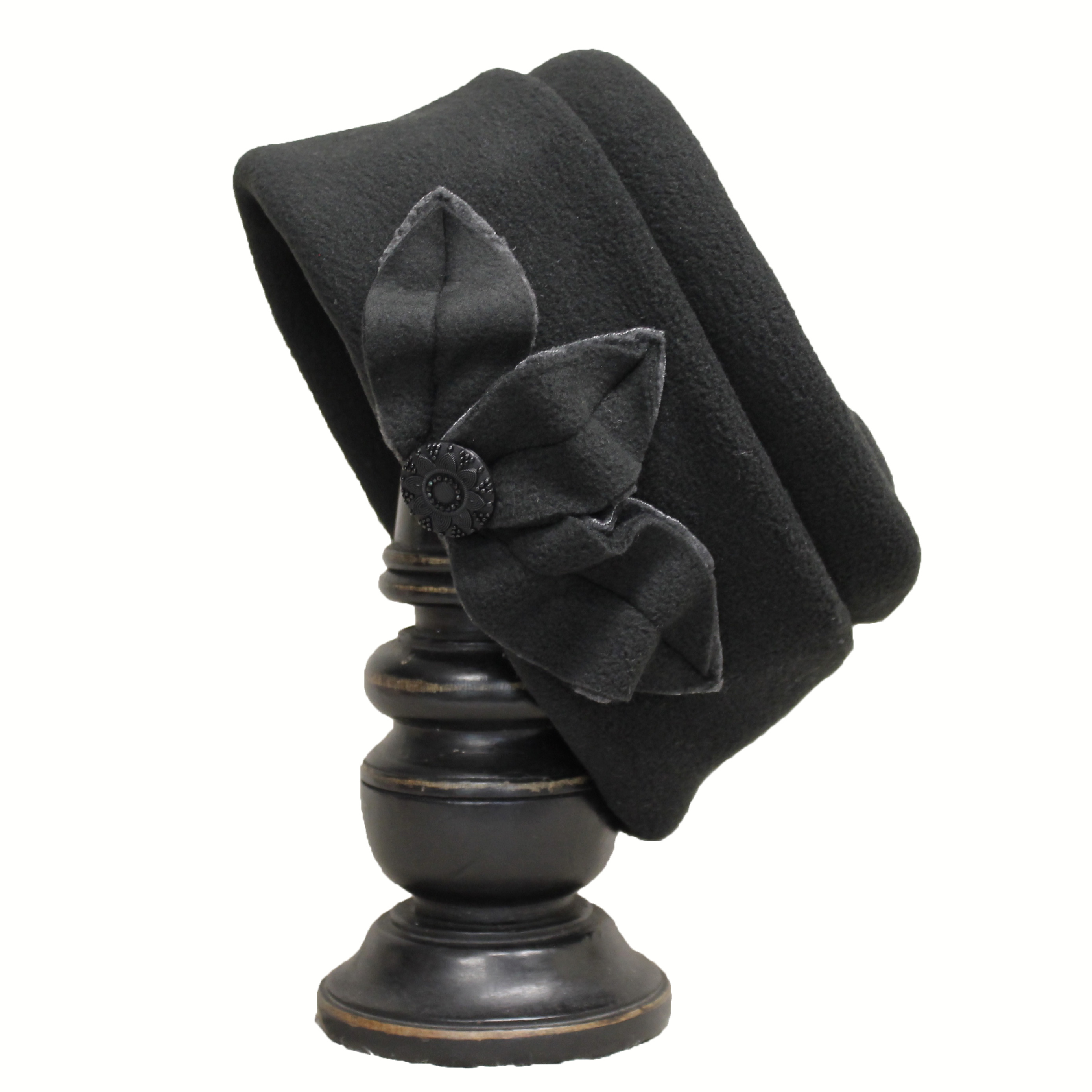 There are two layers of fleece for each leaf. This one has a grey leaf under a black leaf, which makes the black leaf show a little more. Big button that's a replica of an 1860s button.