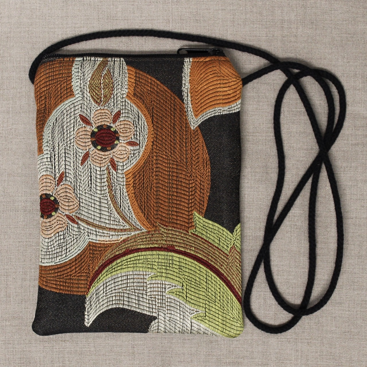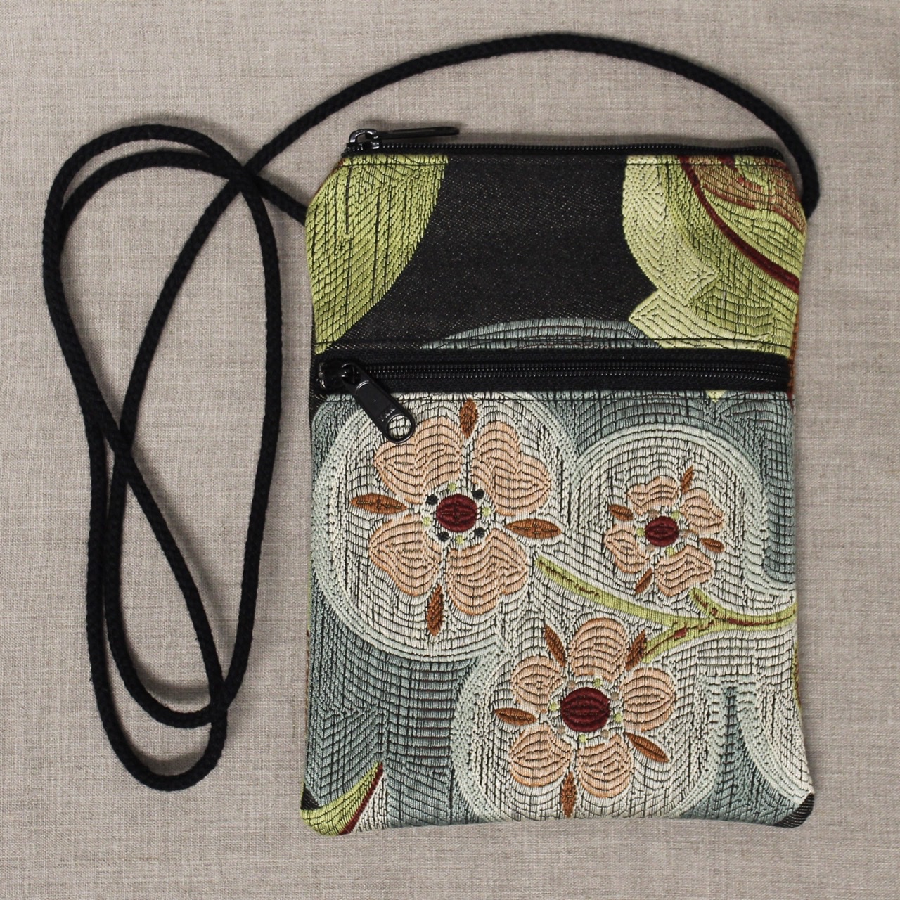 These crossbody bags are made of long-wearing upholstery fabric, with a sturdy gold, grey, or tan twill lining (like a pair of Dockers pants). They have a cord strap with a zippered top opening. There is one outside zippered pocket.