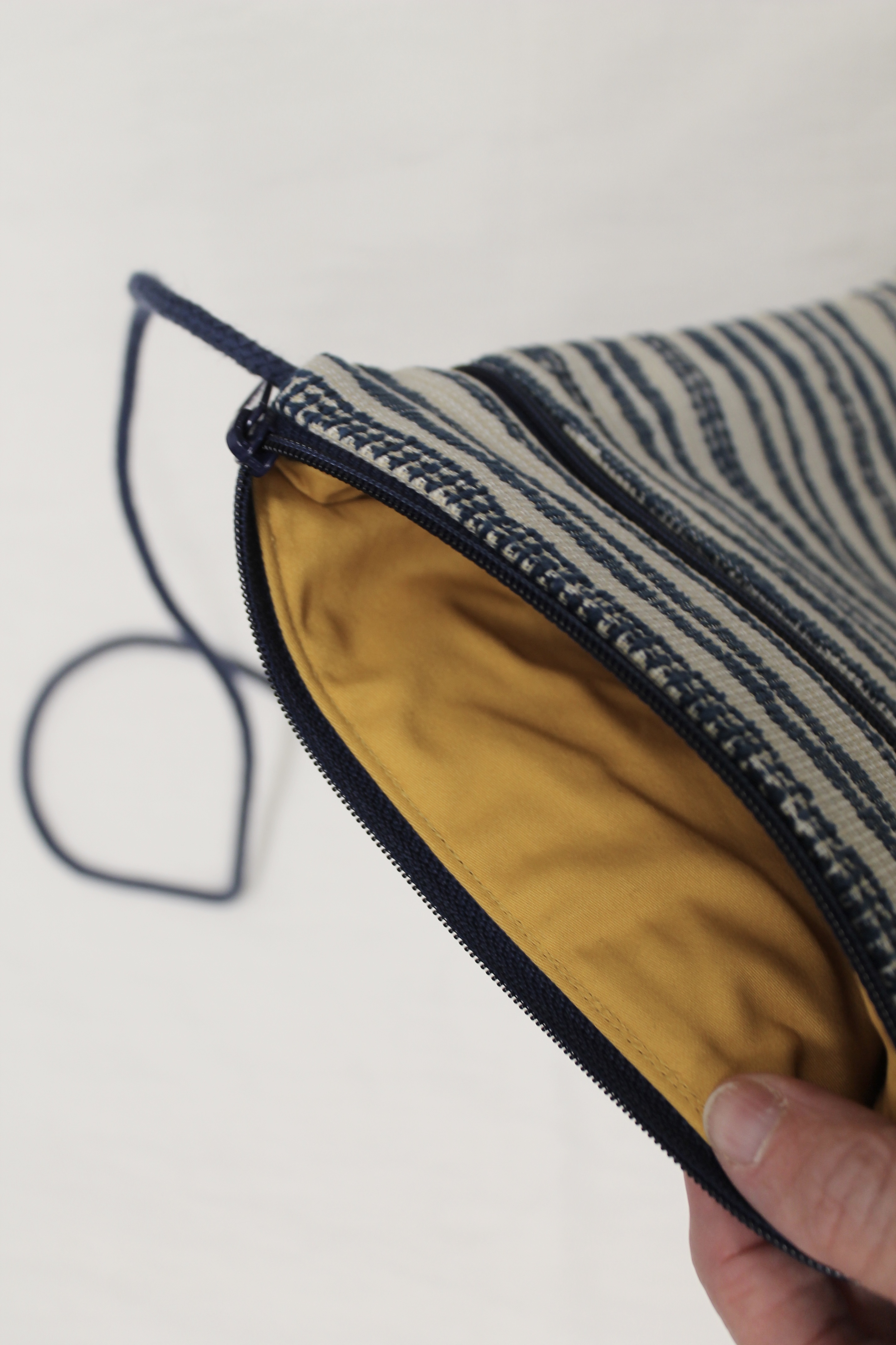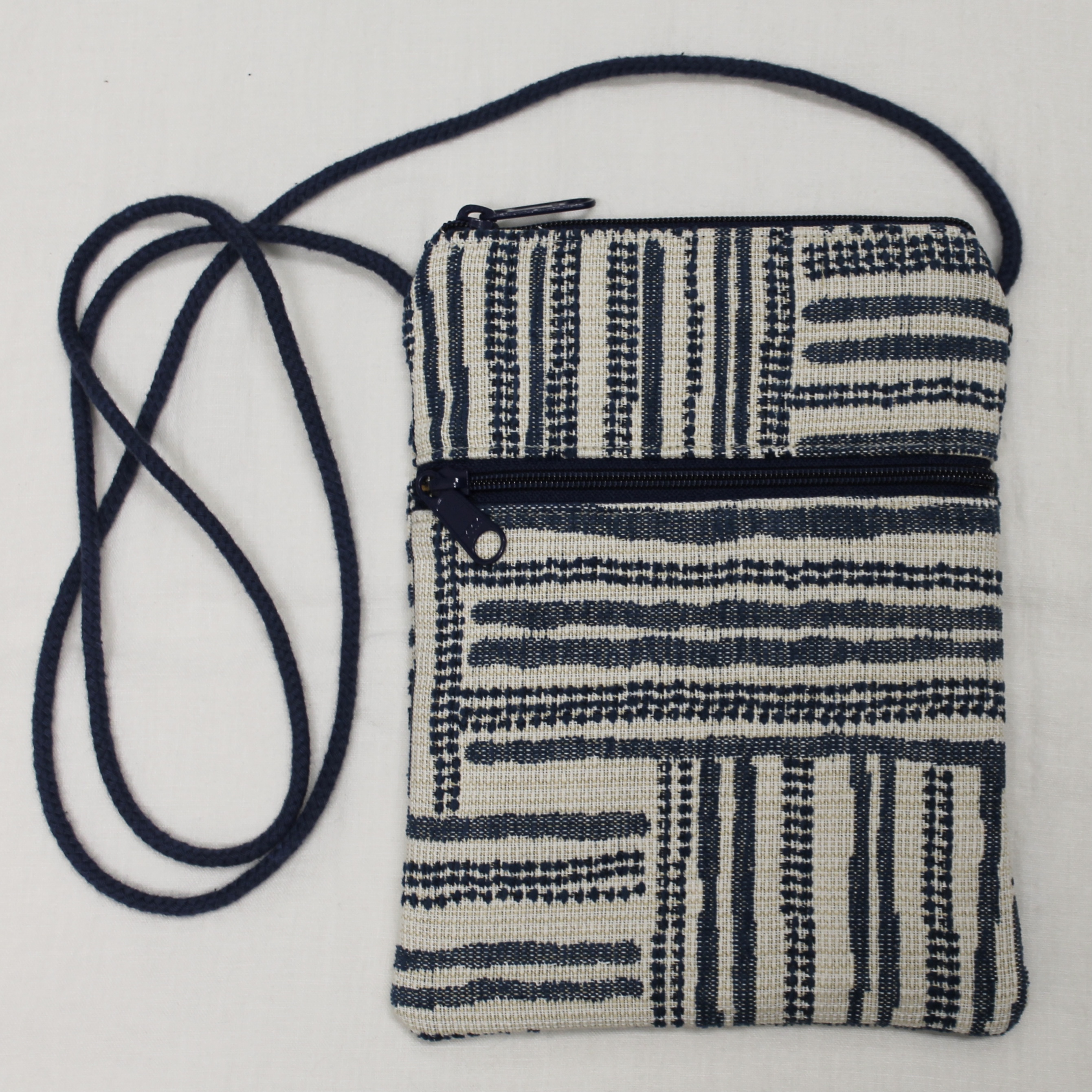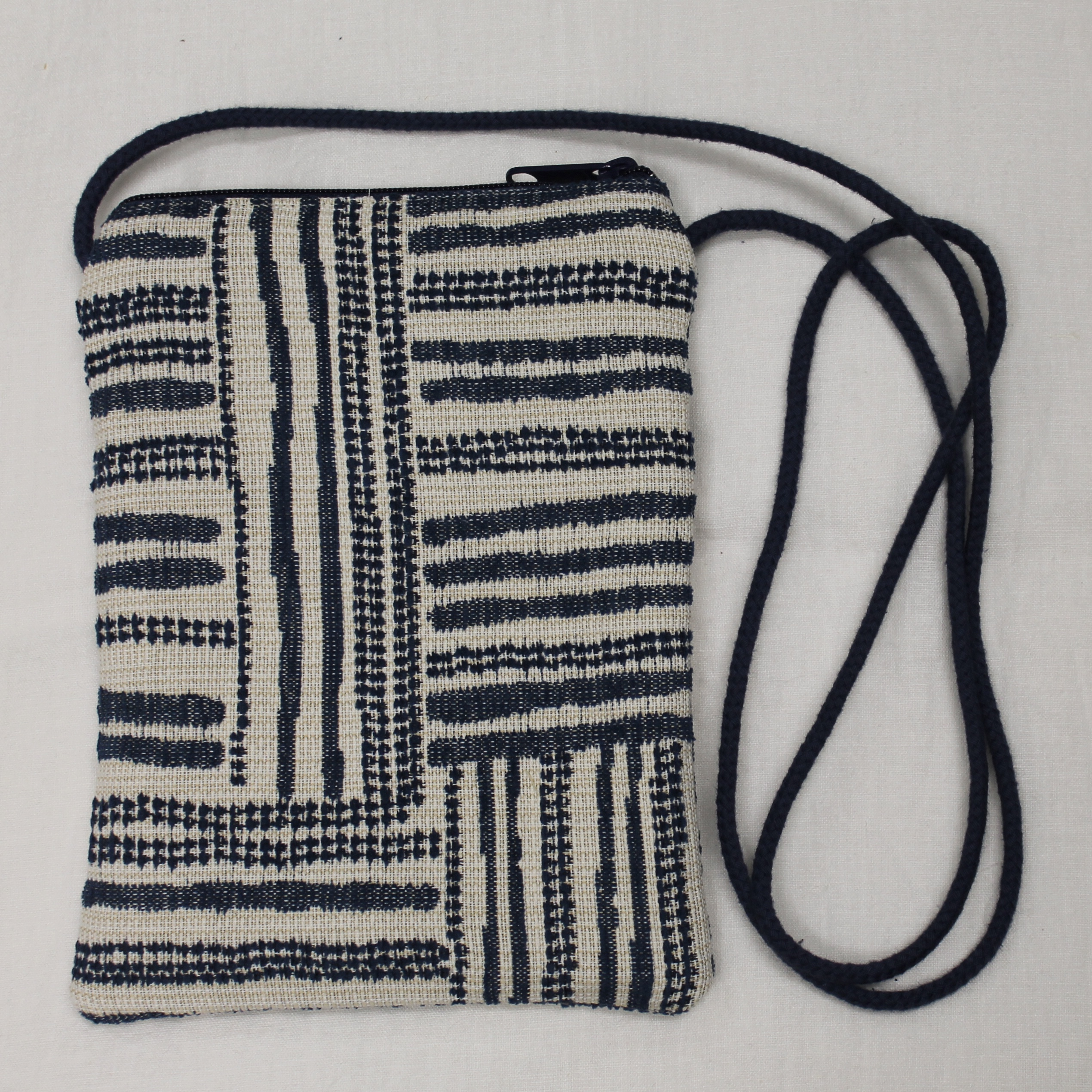 These crossbody bags are made of long-wearing upholstery fabric, with a sturdy gold, grey, or tan twill lining (like a pair of Dockers pants). They have a cord strap with a zippered top opening. There is one outside zippered pocket.