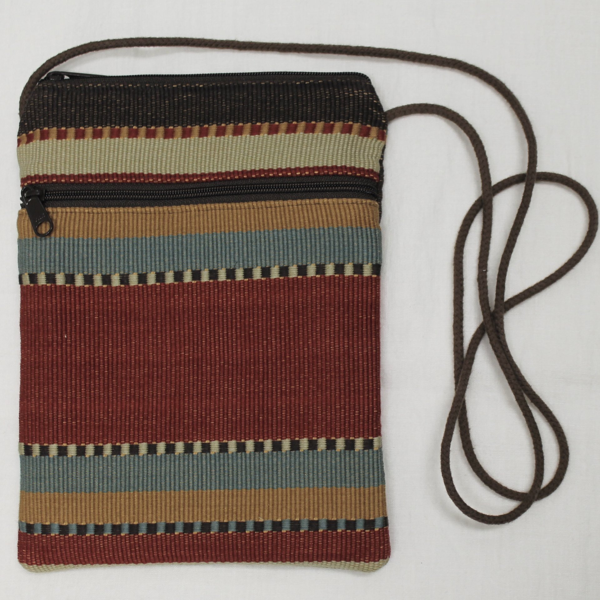 These crossbody bags are made of long-wearing upholstery fabric, with a sturdy gold, grey, or tan twill lining (like a pair of Dockers pants) with an interior pocket. They have a cord strap with a zippered top opening. One outside pocket is open and is great for keys and phone. On the other side is a zippered pocket that's great to secure papers or cards.