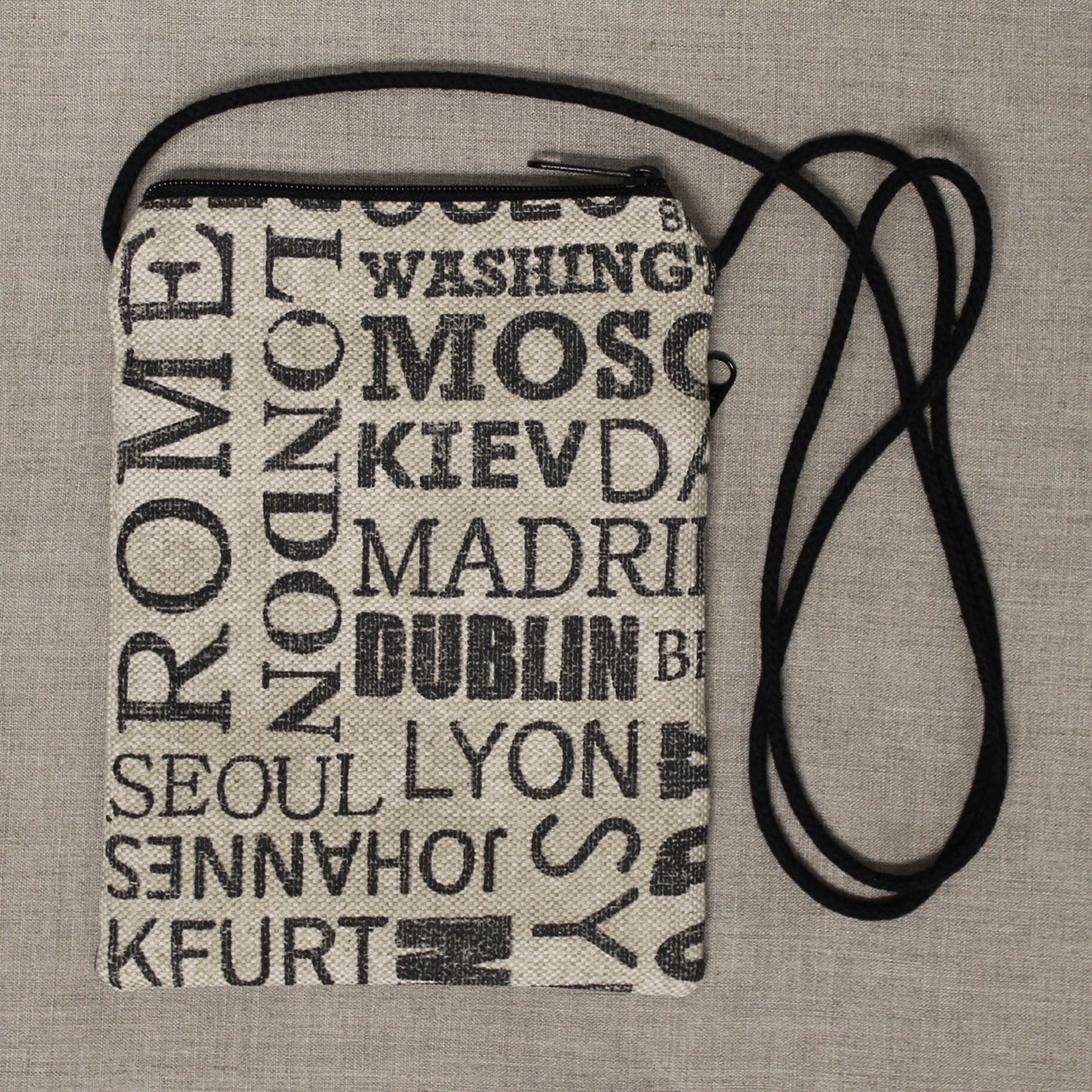 These crossbody bags are made of long-wearing upholstery fabric, with a sturdy gold, grey, or tan twill lining (like a pair of Dockers pants). They have a cord strap with a zippered top opening. There is one outside zippered pocket.