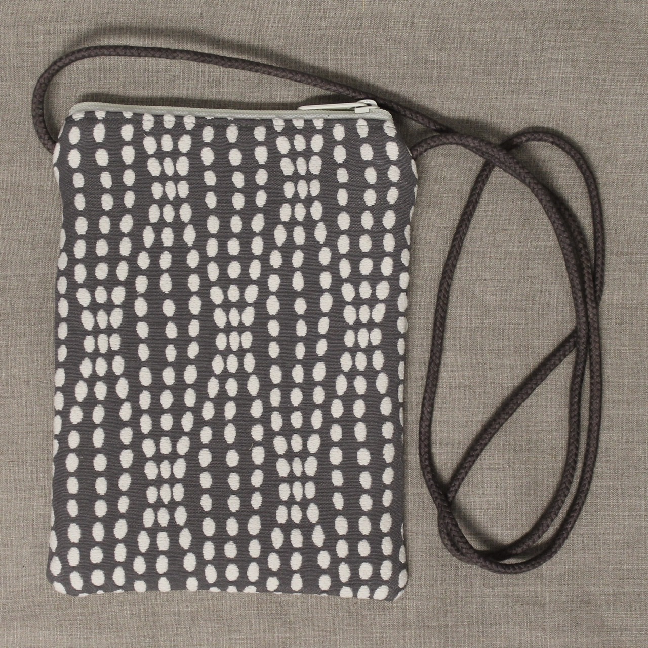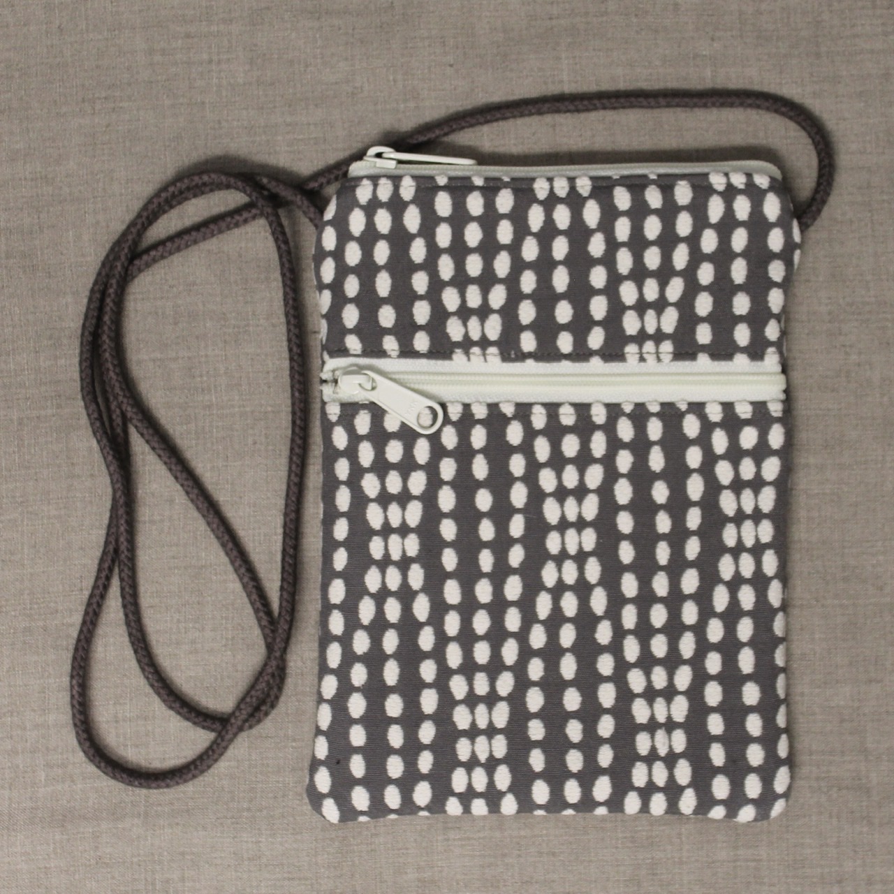 These crossbody bags are made of long-wearing upholstery fabric, with a sturdy gold, grey, or tan twill lining (like a pair of Dockers pants). They have a cord strap with a zippered top opening. There is one outside zippered pocket.
