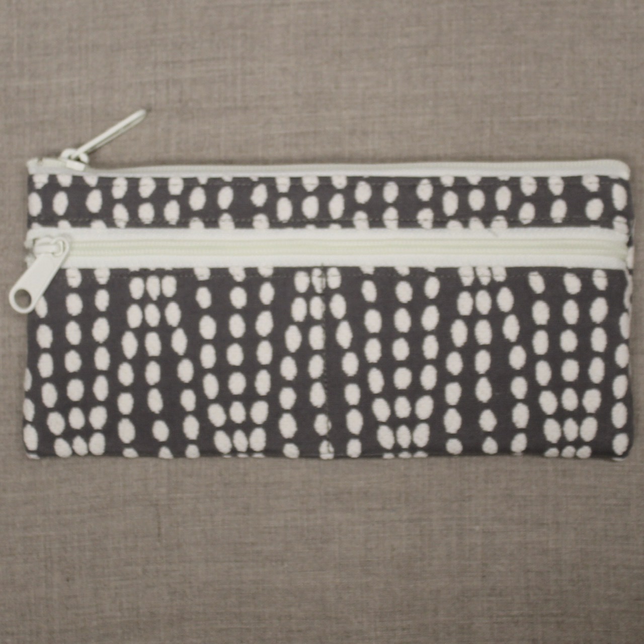 Prairie Sun Design wallets can hold any number of things--money and cards, cosmetics, colored pencils. There is a top zip that opens into the pouch body. There's also a side zip, with a seam sewed halfway across the pocket so that the side pocket is split into two pockets, each big enough to hold credit cards. Also good for coins, or little stuff like I keep in mine: earrings and hair elastics.