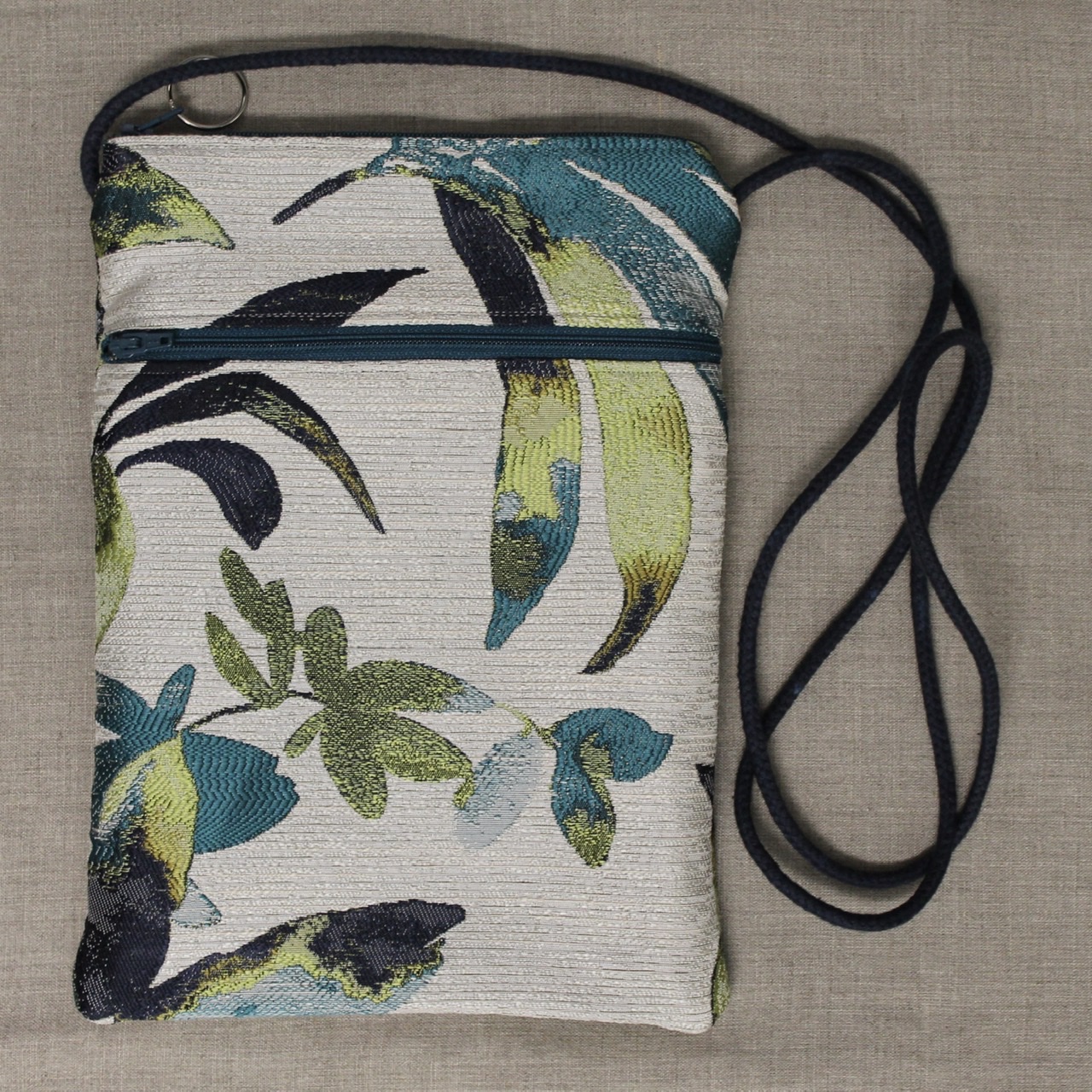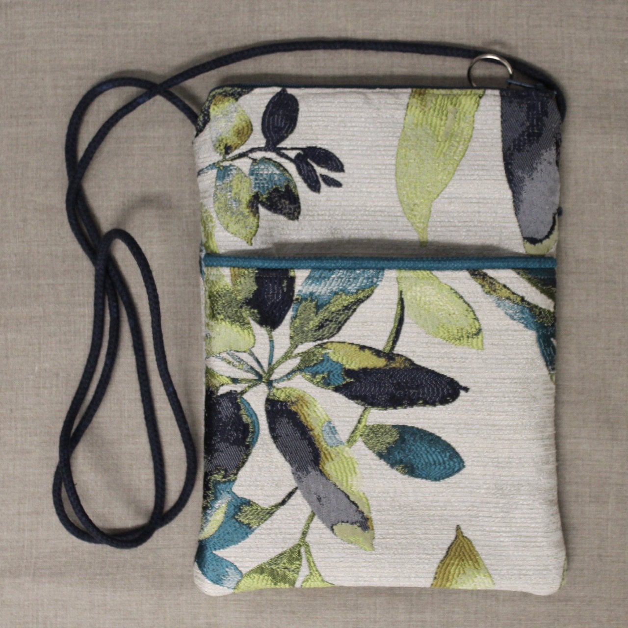 These crossbody bags are made of long-wearing upholstery fabric, with a sturdy gold, grey, or tan twill lining (like a pair of Dockers pants) with an interior pocket. They have a cord strap with a zippered top opening. One outside pocket is open and is great for keys and phone. On the other side is a zippered pocket that's great to secure papers or cards.